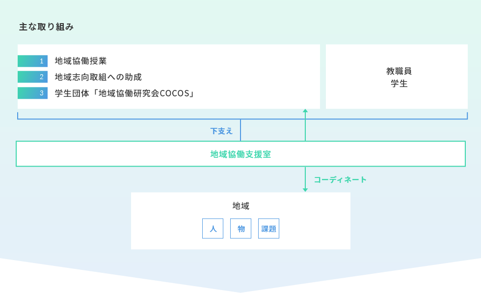 教員による「地域志向研究」および「地域志向教育プログラム」、学生団体による「学生自主プロジェクト」の三部門において、それぞれ学内公募からの審査を経て、地域との協働取組を助成しています。