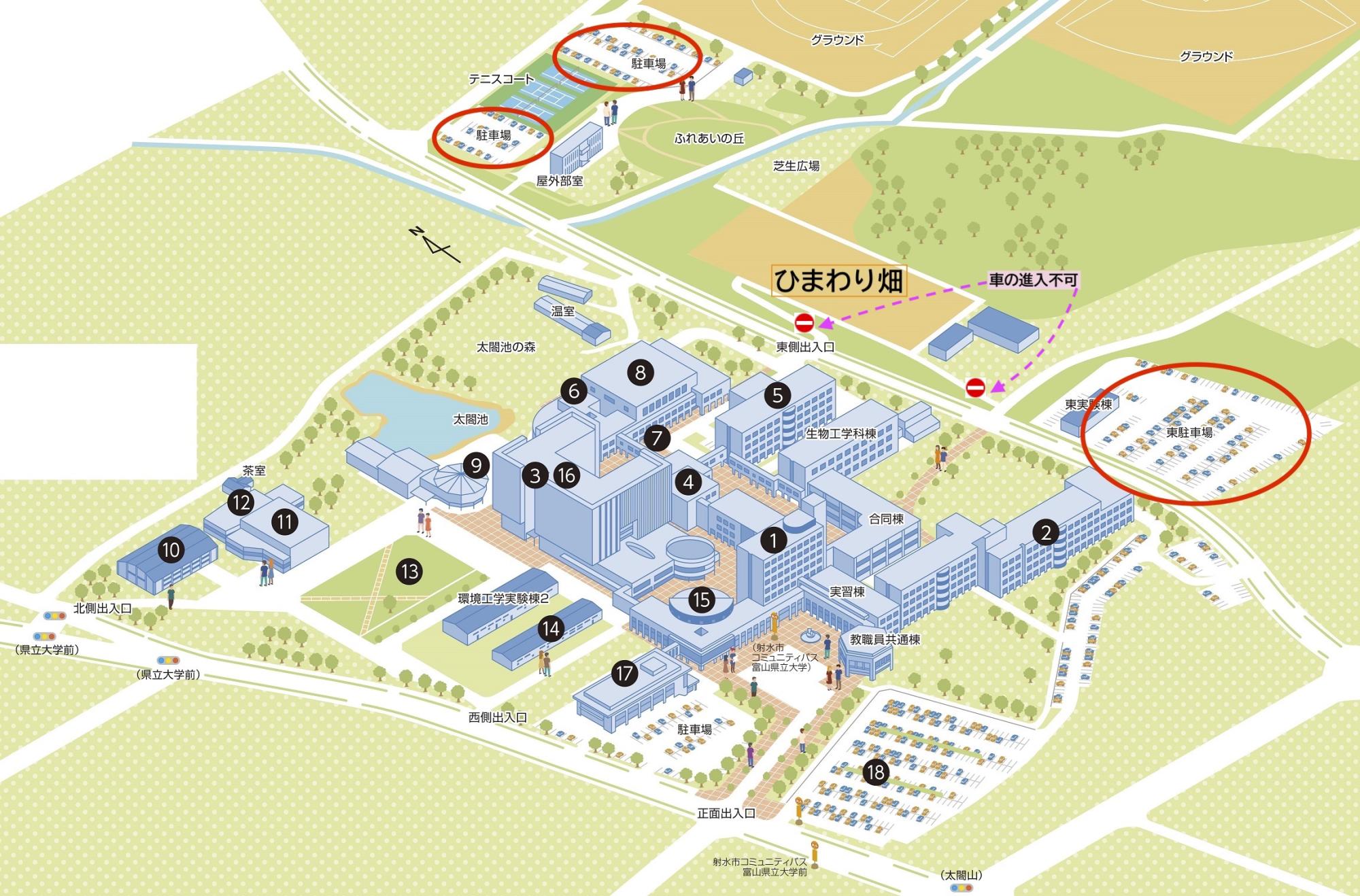 - 車でお越しの方は本学の駐車場をご利用ください。付近道路への駐停車はやめてください。特に8月2日(土)はダヴィンチ祭も開催されており、混雑する可能性があります。係員の誘導に従ってください。なお、迷路実施期間は、畑への車の進入を禁止しております。